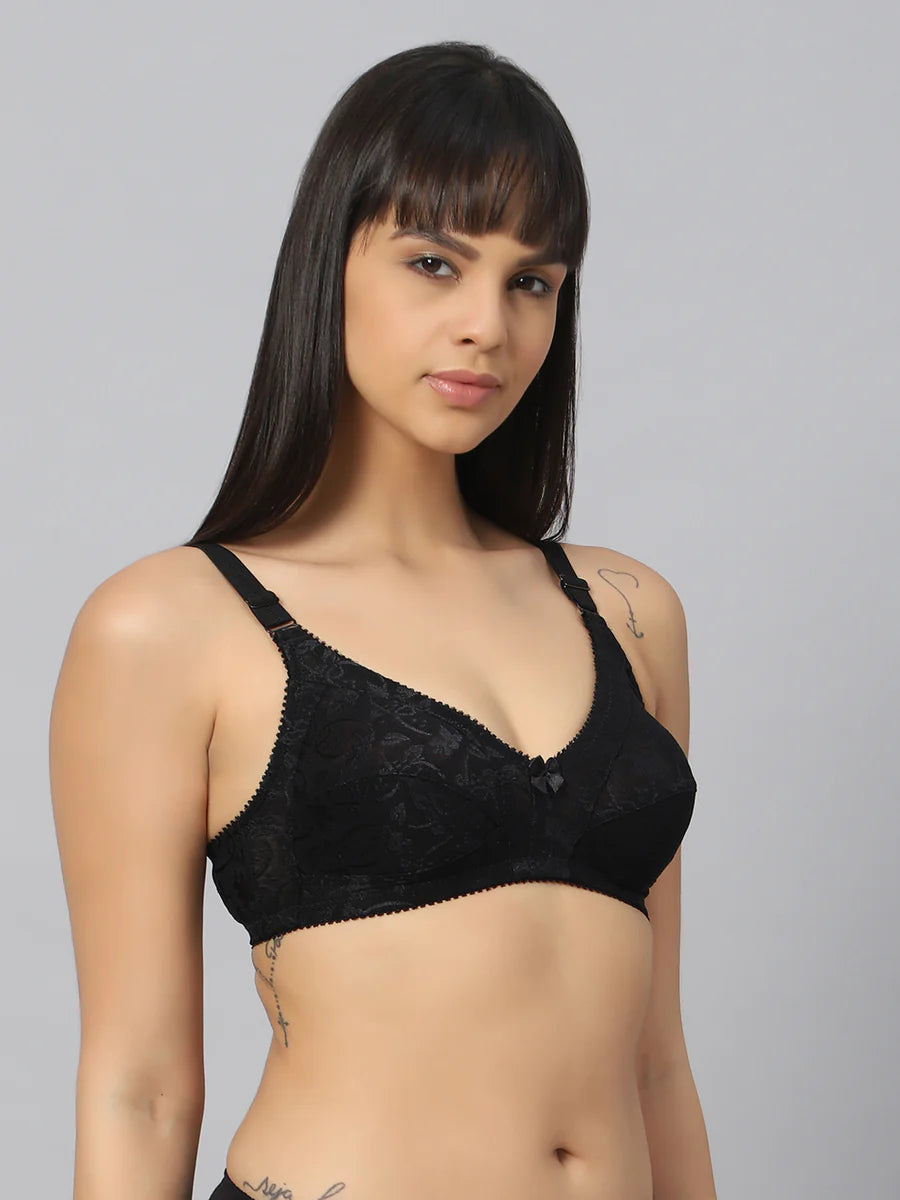 Made of fine quality butterfly print  jacquard net stretchable fabric in full coverage design. Stretchable fabric for sung fit. Half cups have 100% cotton linings for maximum comfort. Broad shoulder elastic for better support. Extra panels along cups to minimize bulges on sides. Available in...